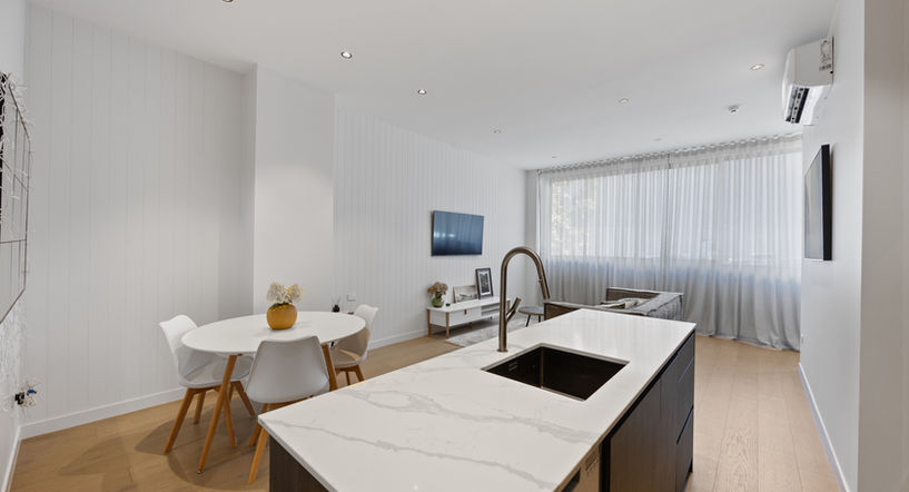 The layout is clean and functional. A large stone island anchors the kitchen. Warm timber flooring runs through the living.